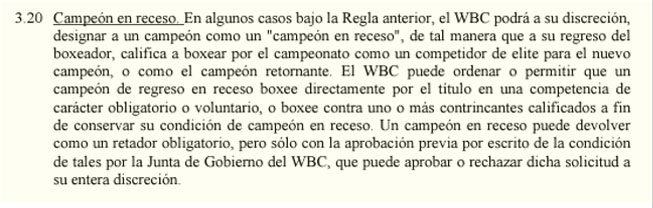 De todas maneras, la forma ambigua y confusa en que los reglamentos del CMB han sido redactados, la condición de campeón en receso, según el texto, acepta cualquier interpretación. Hasta las más absurdas, debido a la frase ‘a total discreción» que se repite en cada estatuto y hasta dos veces en el correspondiente al campeón en receso.